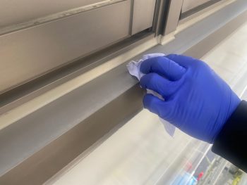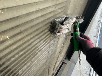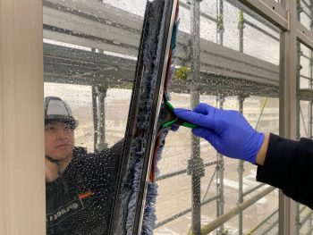 ガラス全体を洗剤のついたシャンパーで擦っていき、スクイジーで綺麗にしていきます。