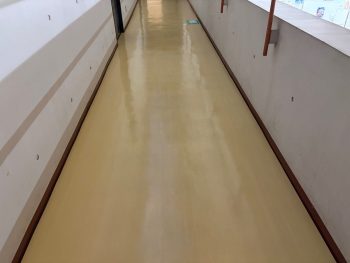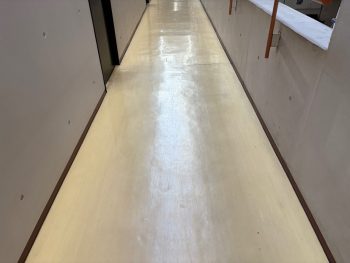 今回の洗浄ワックス清掃により、廊下全体が明るくなり、